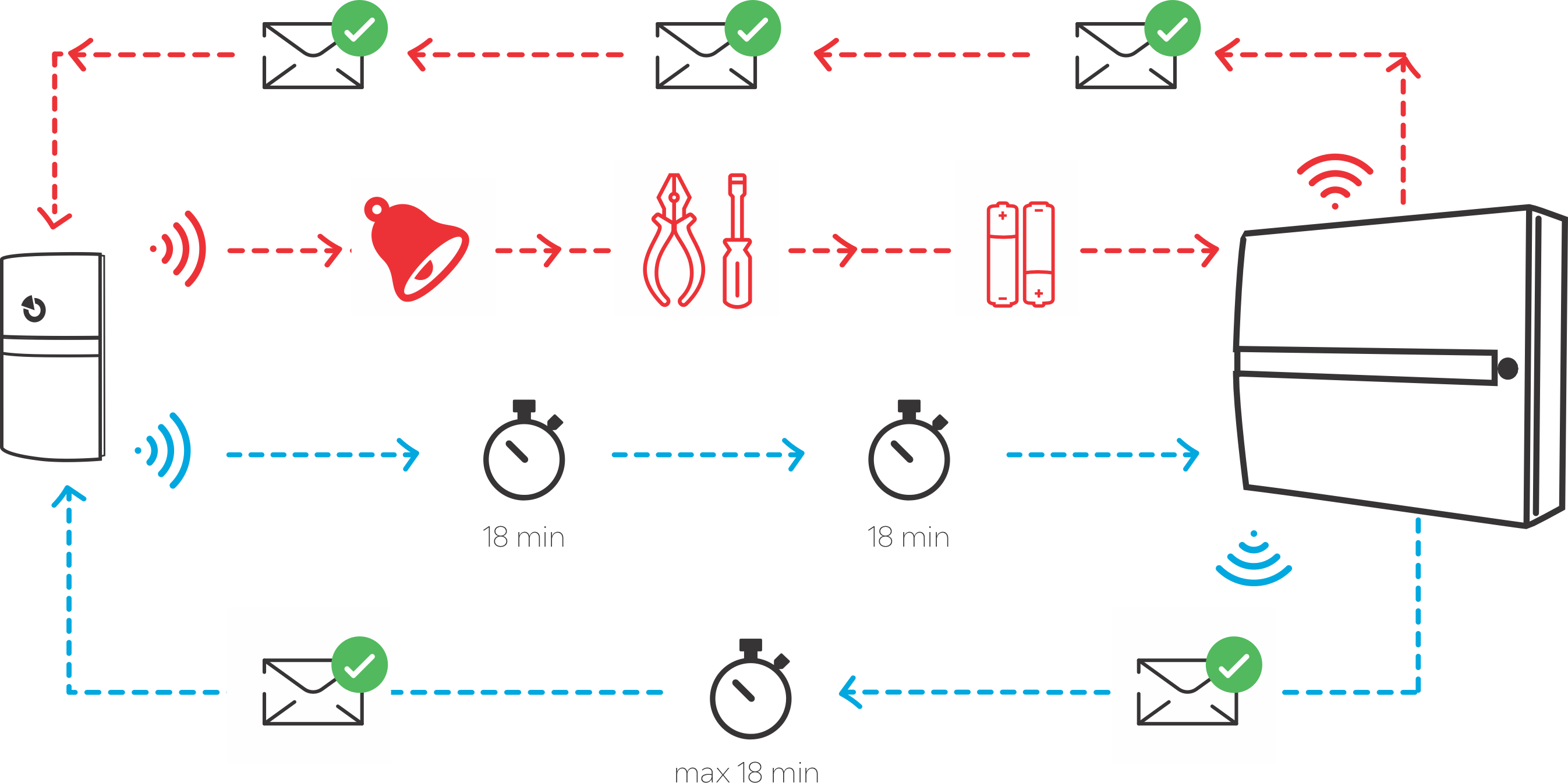- However, if the periphery is in a dormant state without external stimuli, it only transmits a control transmission every 18 minutes. Even in the case of a control transmission, the control panel responds and can send a new configuration.
