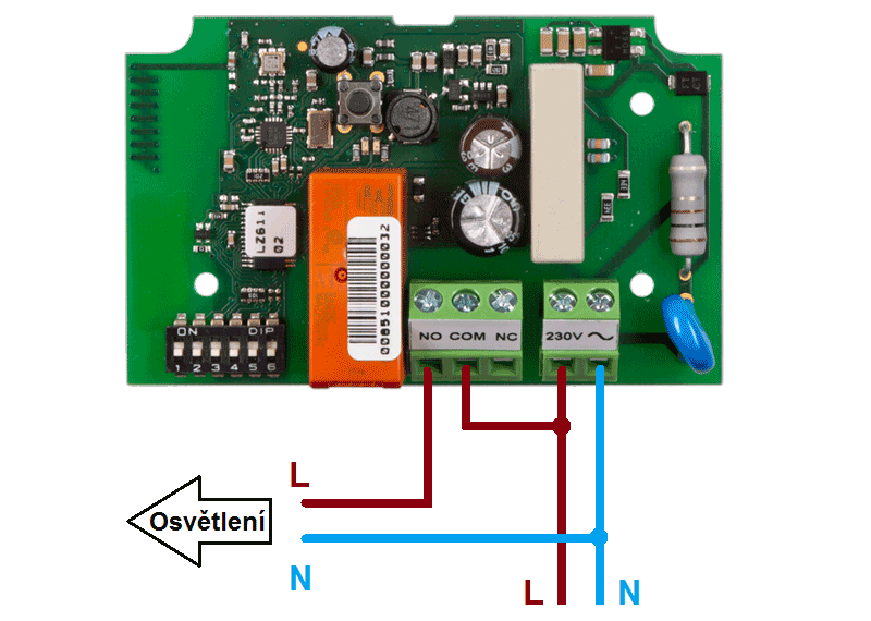 - Pripojte výstupné L a N do svorkovnice osvetlenia, viz obrázok 1. POZOR! Maximálna spínacia záťaž relé je 16A!