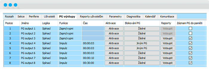 V príklade je použité celkom osem PG výstupov, pričom výstupy PG1 a PG2 sú dva zapojené svetelné okruhy, PG3 až PG8 zabezpečujú blikanie svetiel a následné blokovanie tejto funkcie po odistení, prípadne po uplynutí definovaného času po poplachu. POZOR, u PG3 až PG8 musí byť povolený záznam do pamäte. Všetky nastavenia vykonáte pomocou F-Linku v záložke Nastavenia/PG výstupy.