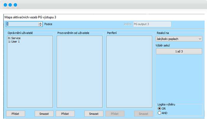 - Ak pomocou PG1 a PG2 už spínate dva okruhy svetiel, začnete nastavením PG3, ktoré budete pri funkcii „Zapni/vypni“ spínať reakciou na „Akýkoľvek poplach“. Ak je v objekte viac sekcií, je vhodné ich všetky povoliť.