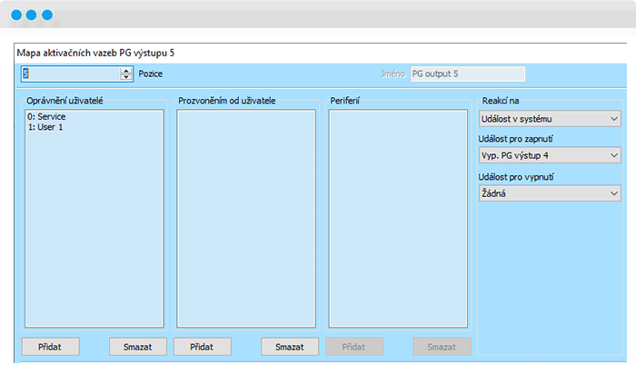 - PG5 bude zabezpečovať prestávku v blikání. Tiež ho nastavíte na funkciu „Impulz“ na 3 sekundy, spínať ho budete reakciou na „Udalosť v systéme“ a vyberiete „Vyp. PG výstup 4“.
