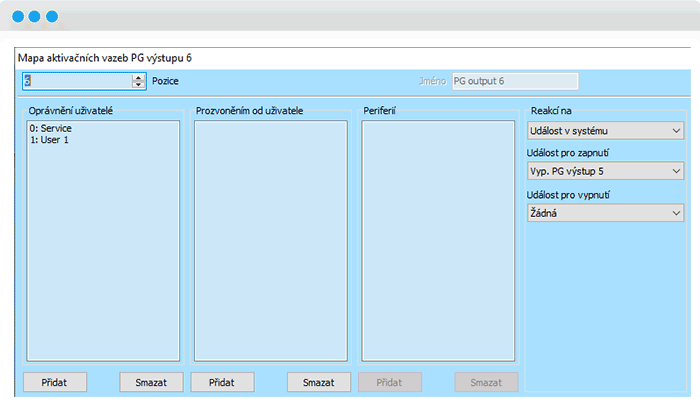 - Smyčku uzavriete nastavením PG6. Opäť nastavíte funkciu „Impulz“ na 3 sekundy, spínať ho budete reakciou na „Udalosť v systéme“ a vyberiete „Vyp. PG výstup 5“.