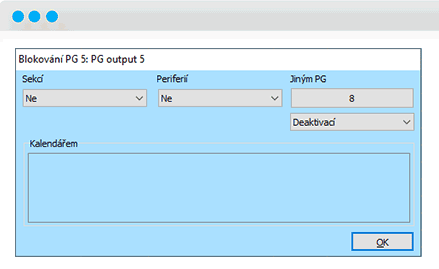 Funkciu tohto PG následne prepojíte s PG5 tak, že u PG5 nastavíte blokovanie „Iným PG“, vyberiete PG8 a „deaktiváciou“. Ak teda dôjde k uplynutiu stanovenej doby od začiatku poplachu, dôjde k deaktivácii PG8, čo zablokuje slučku blikania.